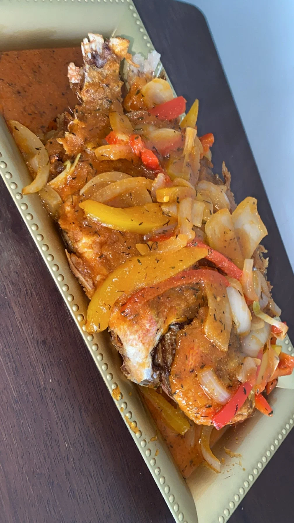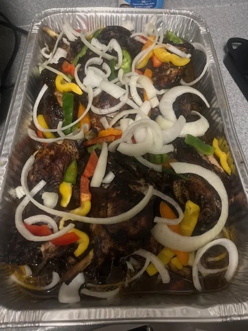 Golden-fried whole snapper topped with a spicy tangy medley of onions and bell peppers. This Jamaican classic is drenched in a flavorful vinegar-based escovitch sauce that soaks into the crispy skin, giving every bite a bold, zesty kick. Fresh, fiery, and full of Caribbean soul